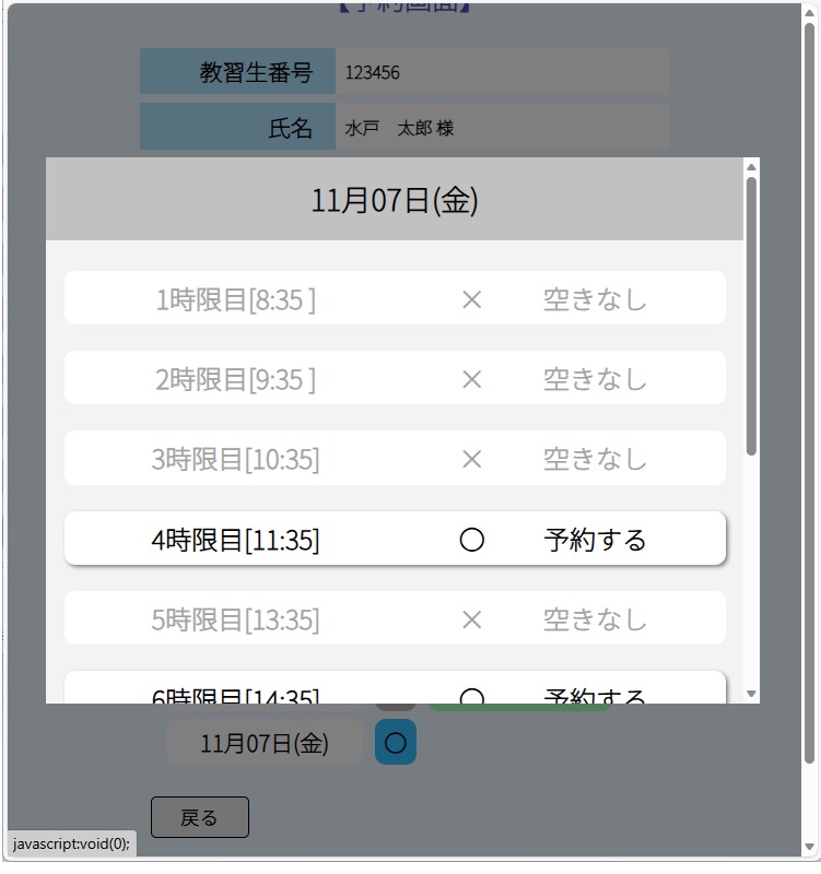 予約を取得したい時限の日付と時限をタッチし、「予約」ボタンを押します。