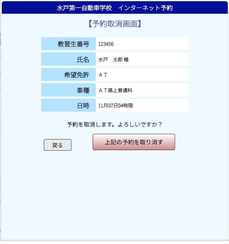 画面で取消内容を確認して、「上記の予約を取り消す」ボタンを押します。