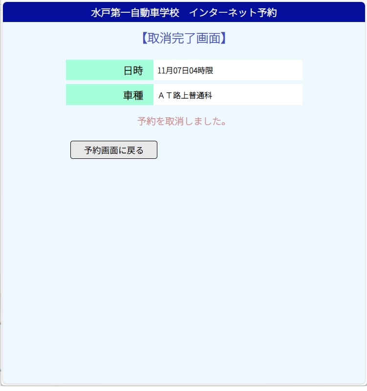 取消完了画面で「予約画面に戻る」ボタンを押すと、現在の予約の空き状況の画面に戻ります。